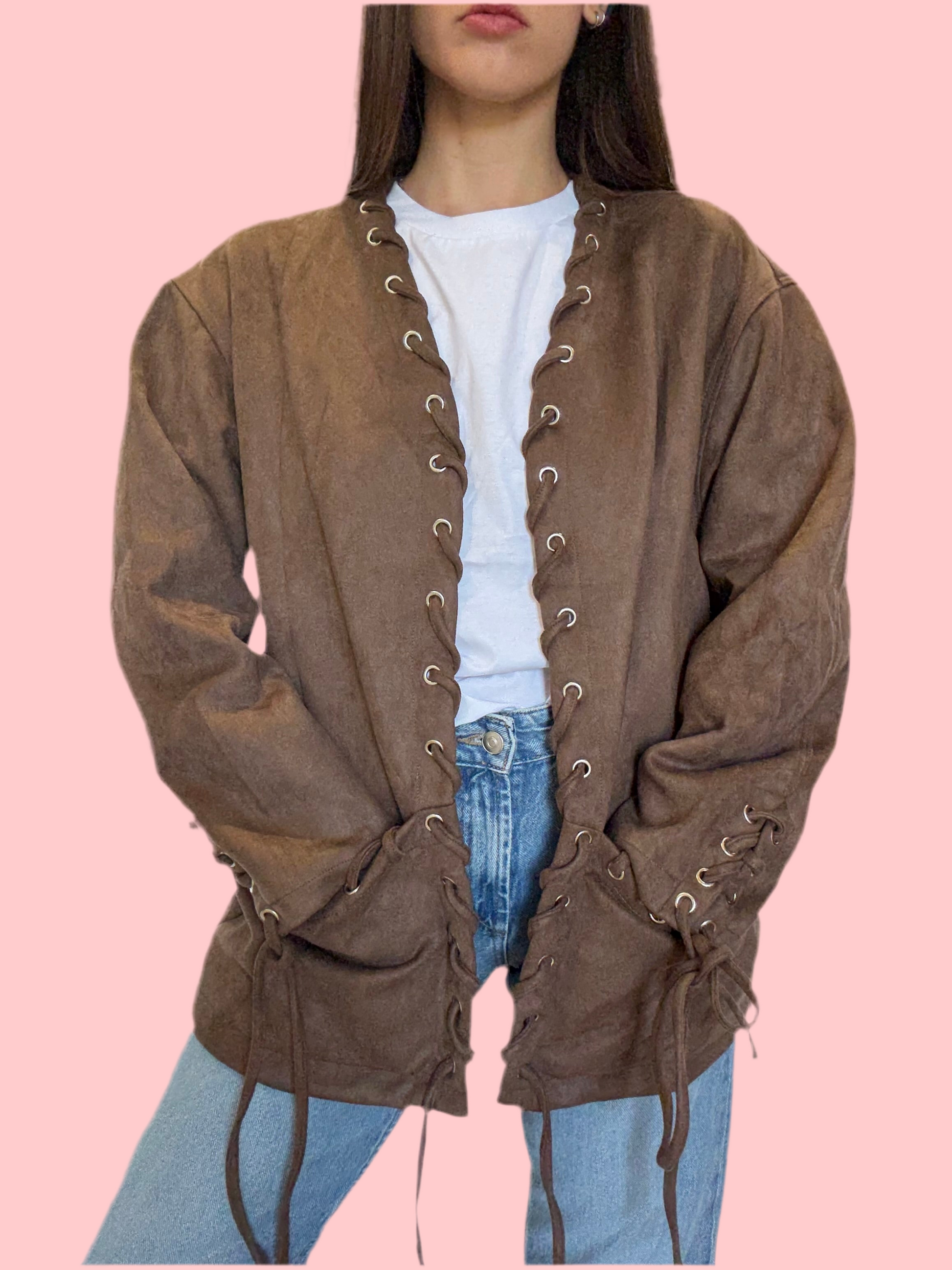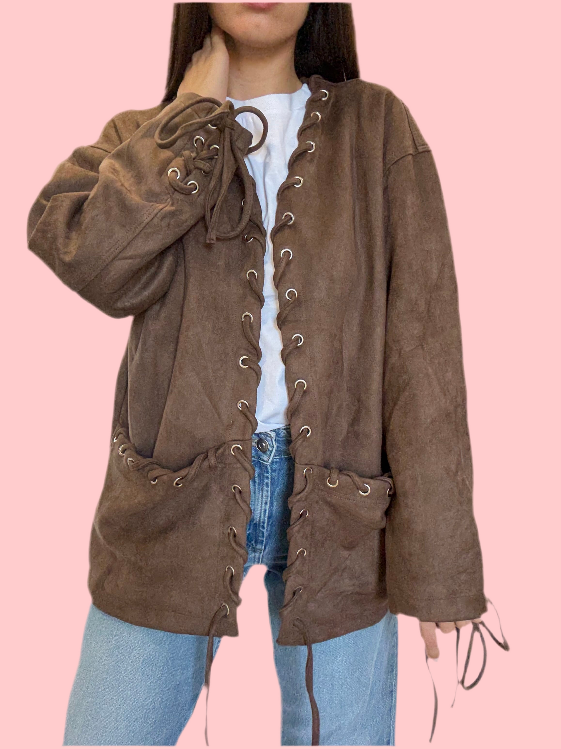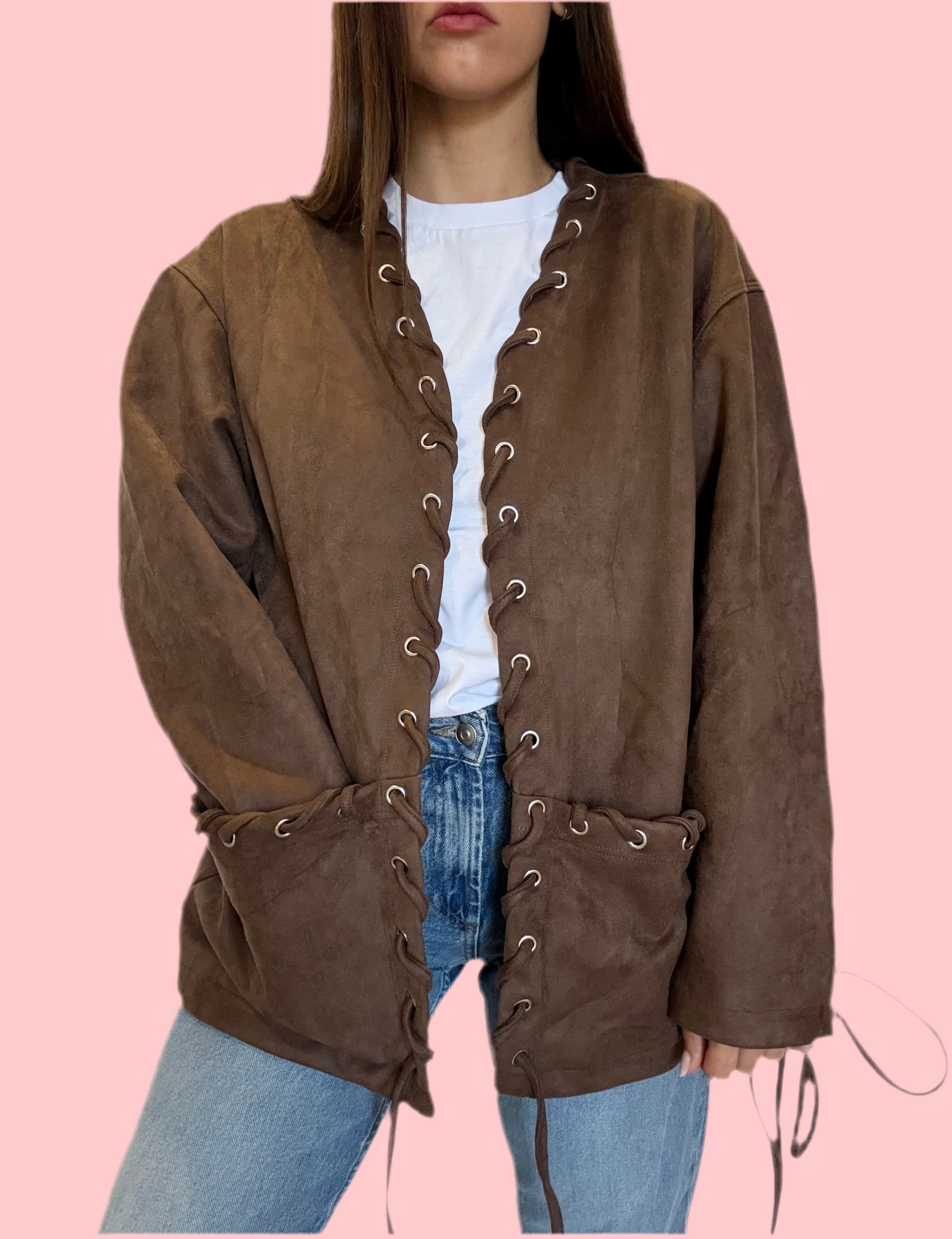 Giacca scamosciata con dettaglio lacci, tasche frontali, taglia unica.