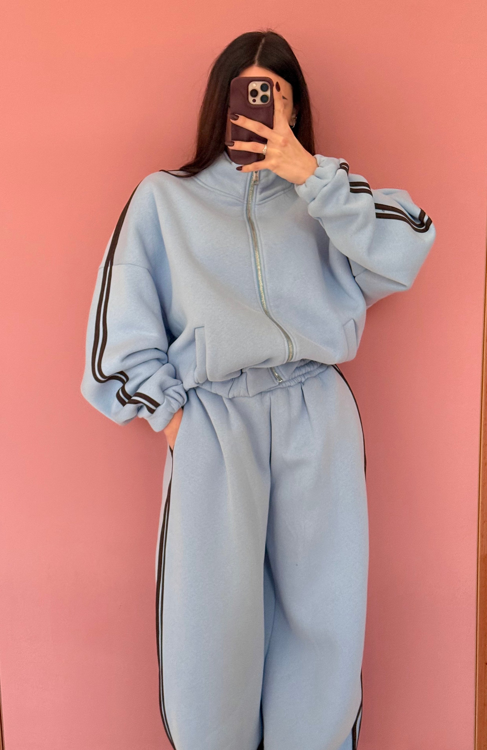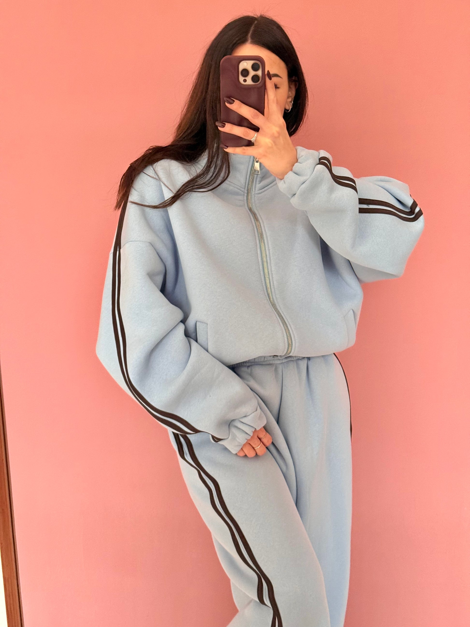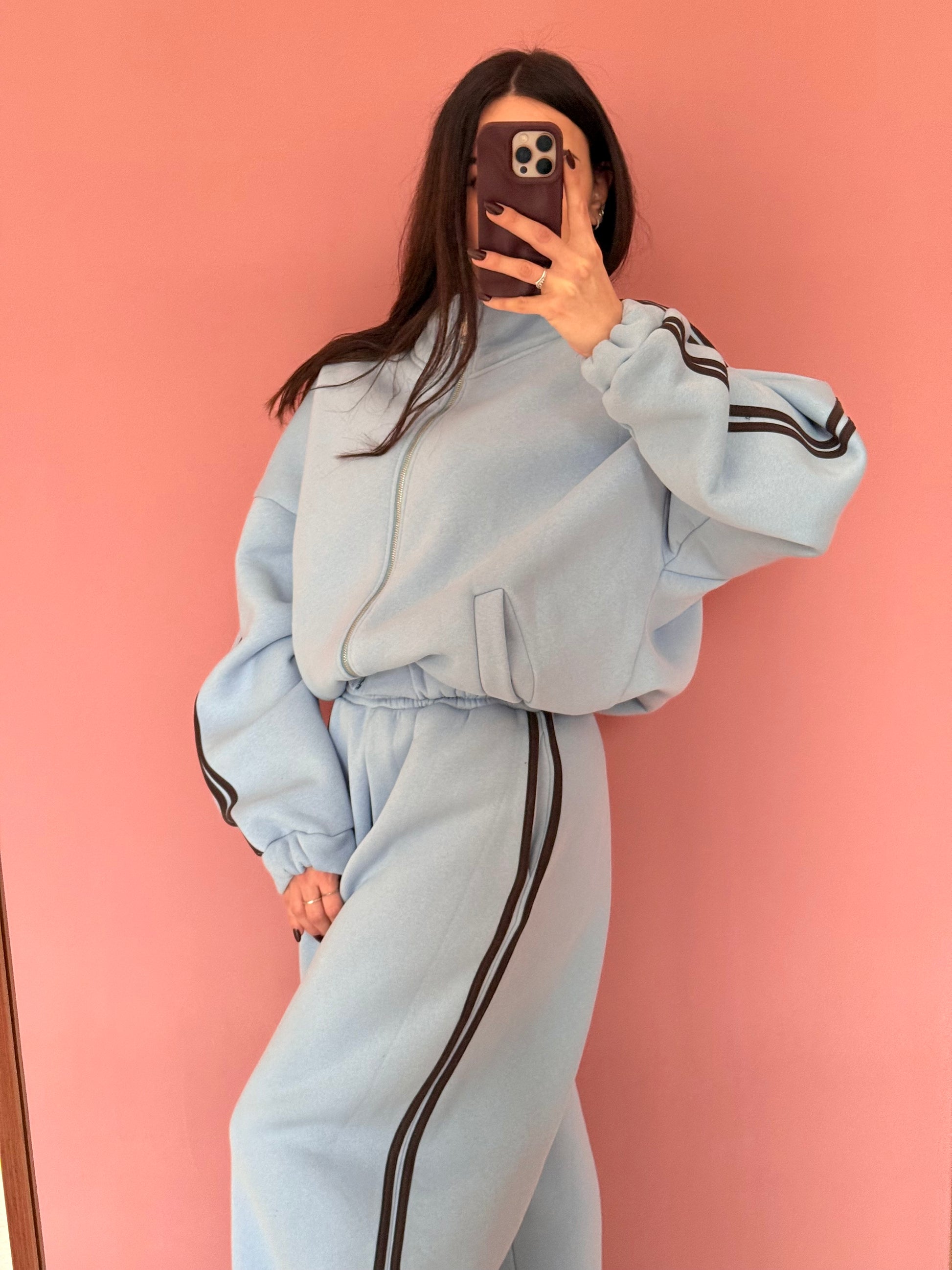 Coordinato tuta felpato, celeste con dettaglio riga cacao . Pantalone gamba dritta ed elastico in vita. Felpa con polsini e zip. Veste dalla XS alla XL . Taglia unica.